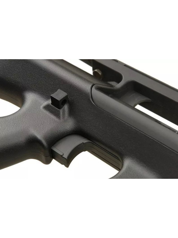Comme pour l’arme réelle, le corps de la réplique est fabriqué en polymère résistant. Une partie est recouverte d’une texture rugueuse antidérapante qui améliore la stabilité de la prise en main. Les pièces métalliques incluent : l’ensemble de l’avant de la réplique avec le canon externe, le module RIS ainsi que divers éléments tels que la plaque de la fenêtre d’éjection ou le cache-flamme.